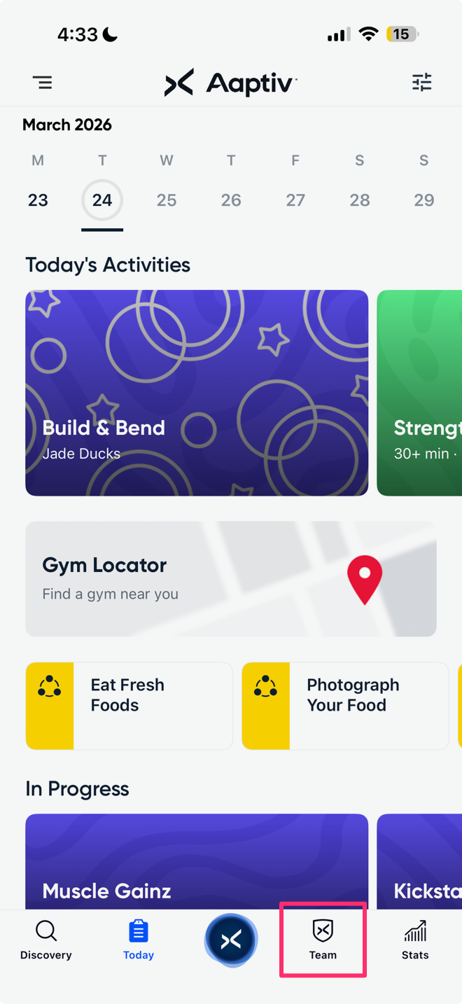 Inside the Team tab, the feed shows posts from other Aaptiv users, including: